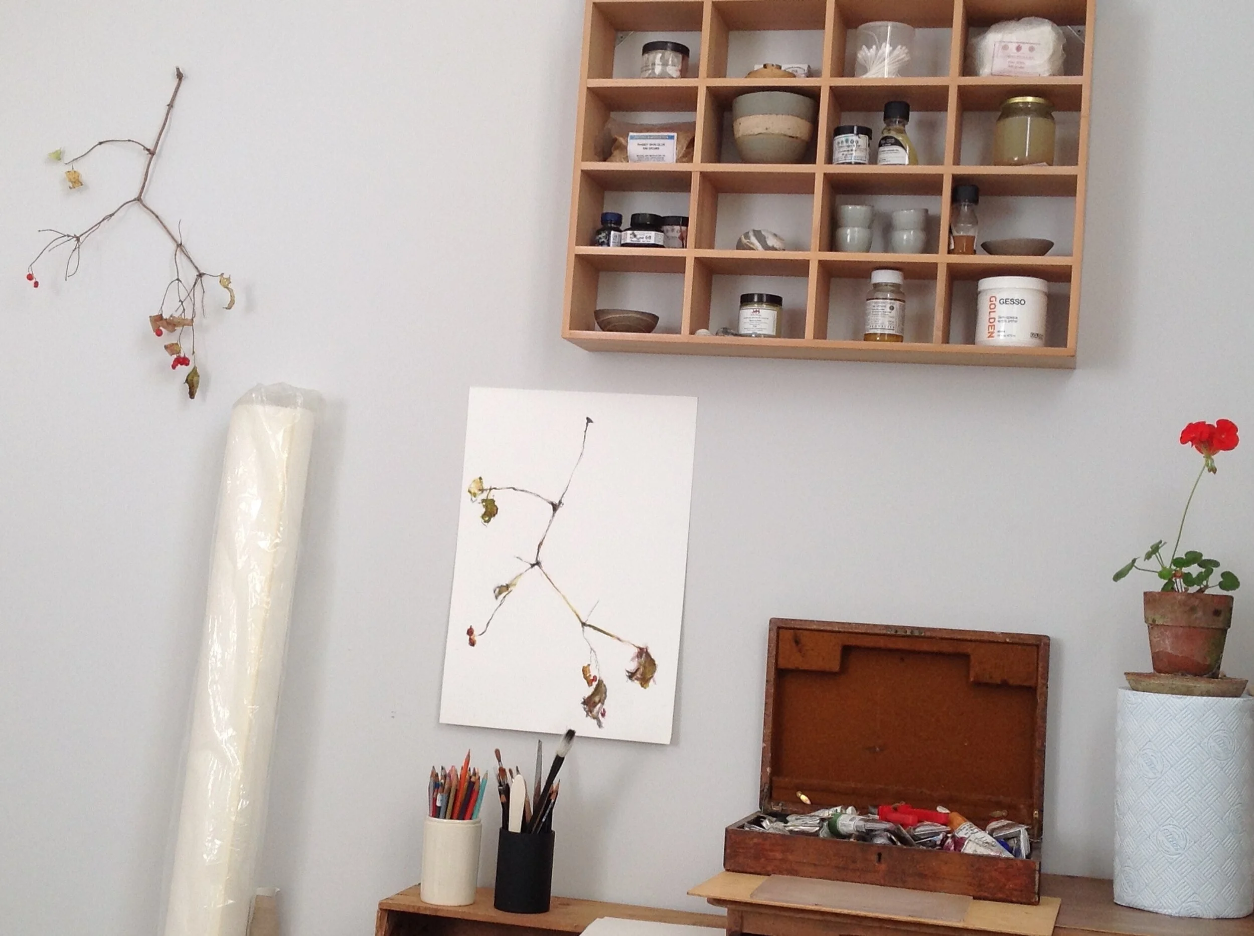 Getting set up to create a small study of the geranium today, sometimes the objects, work in progress, studies and art materials have a sense of movement and dance to them (to my mind’s eye). Like they are warming up themselves and getting ready to sing.